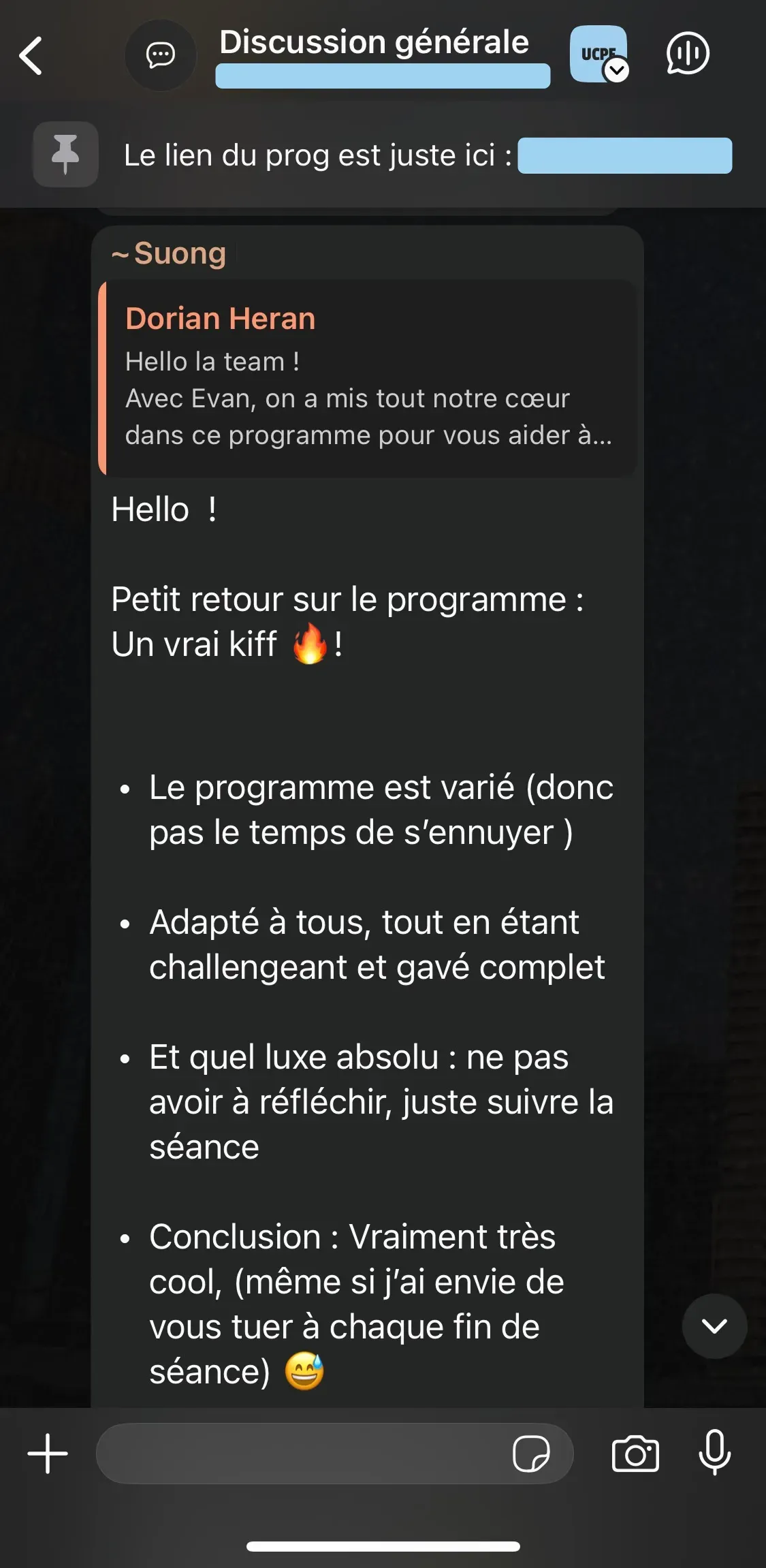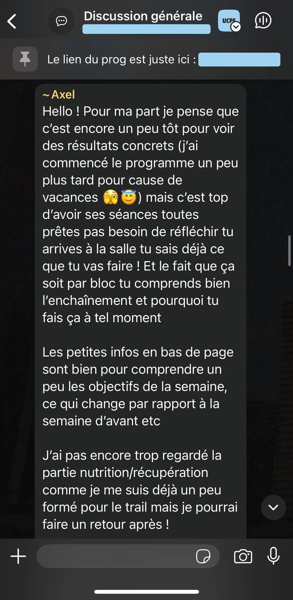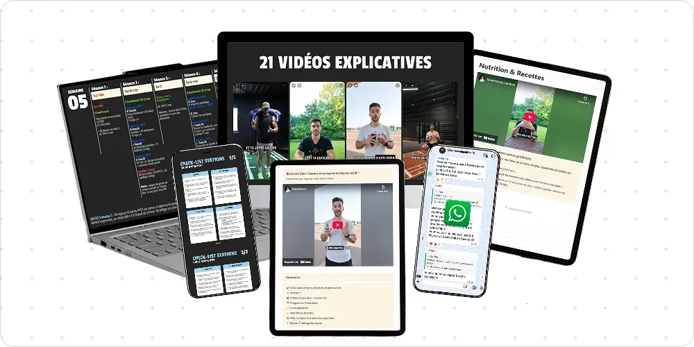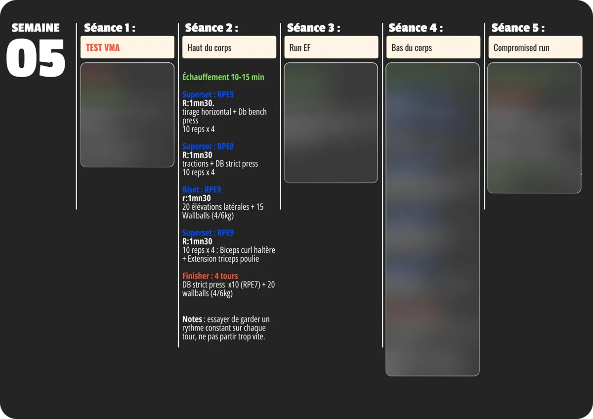 Toutes les séances sont pensées avec un système de RPE (niveau d’effort perçu), pour que tu puisses avancer à ton rythme.