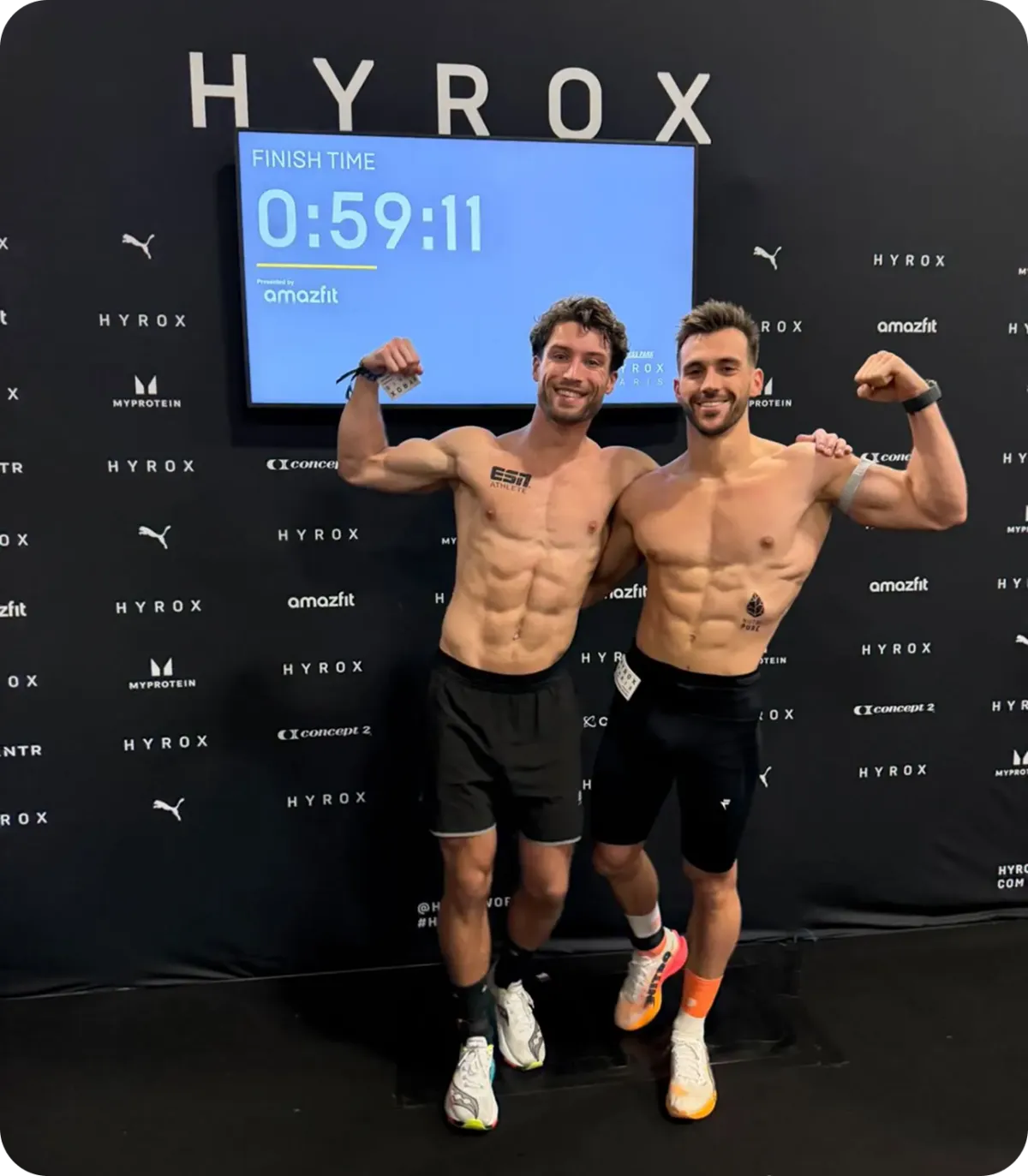 On est deux passionnés d’Hyrox, certifiés coachs Hyrox, et on a créé le programme qu’on aurait aimé avoir à nos débuts.