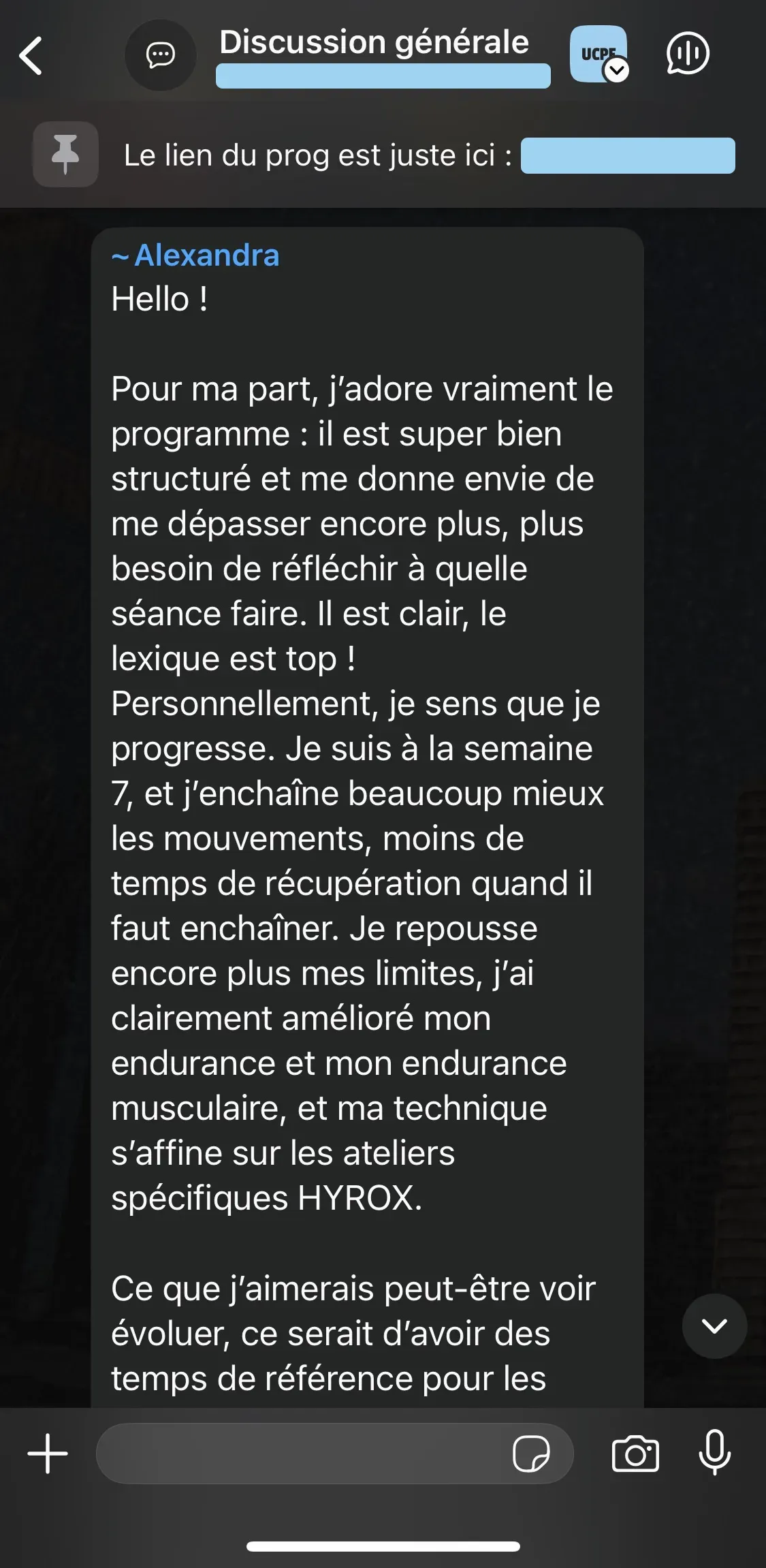 Pendant 16 semaines, je t’accompagne pas à pas avec 80 séances spécifiques pour t’aider à préparer ton Hyrox dans de bonnes conditions.